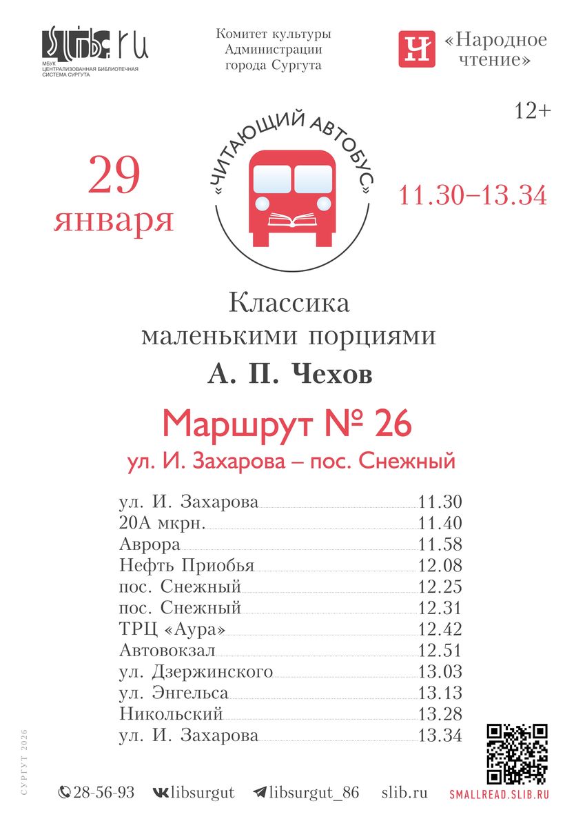 Акция «Читающий автобус» организуется библиотеками на постоянной основе с 2014 года и направлена на продвижение лучших образцов литературы среди жителей и гостей города. В 2026 году сотрудники городских библиотек знакомят пассажиров с авторами пятого сезона проекта «Народное чтение»: Михаилом Зощенко, Аркадием Аверченко, Ильей Ильфом и Евгением Петровым, Тэффи, Антоном Павловичем Чеховым. Это короткие юмористические рассказы, которые не потеряли свою актуальность и в наше время.
