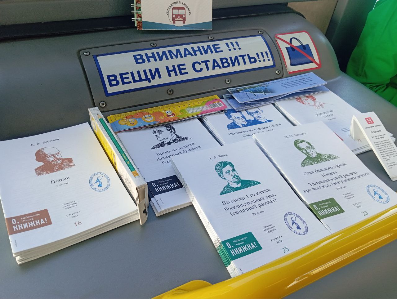 Отличить «читающий» автобус среди другого общественного транспорта просто – он будет обозначен яркими стикерами и соответствующей афишей.