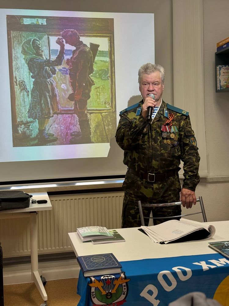 Далее член региональной ассоциации ветеранов ВДВ и войск специального назначения (а также участник ЛитО «Северный огонек») Виктор Царенко провел урок мужества «Да, были люди в наше время…» Виктор Иосифович рассказал о творческом пути и военной службе, прочел свои стихи о войне, исполнил авторские песни. Сургутский поэт подарил библиотеке свою книгу «Есть такая работа – страну защищать!»