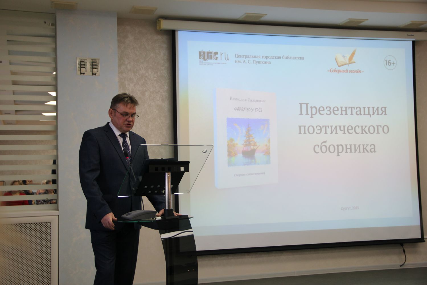 12 октября в Центральной городской библиотеке им. А. С. Пушкина прошла презентация поэтического сборника члена Тюменского областного отделения Союза российских писателей и руководителя сургутского литературного объединения «Северный огонёк» Вячеслава Васильевича Сазановича.