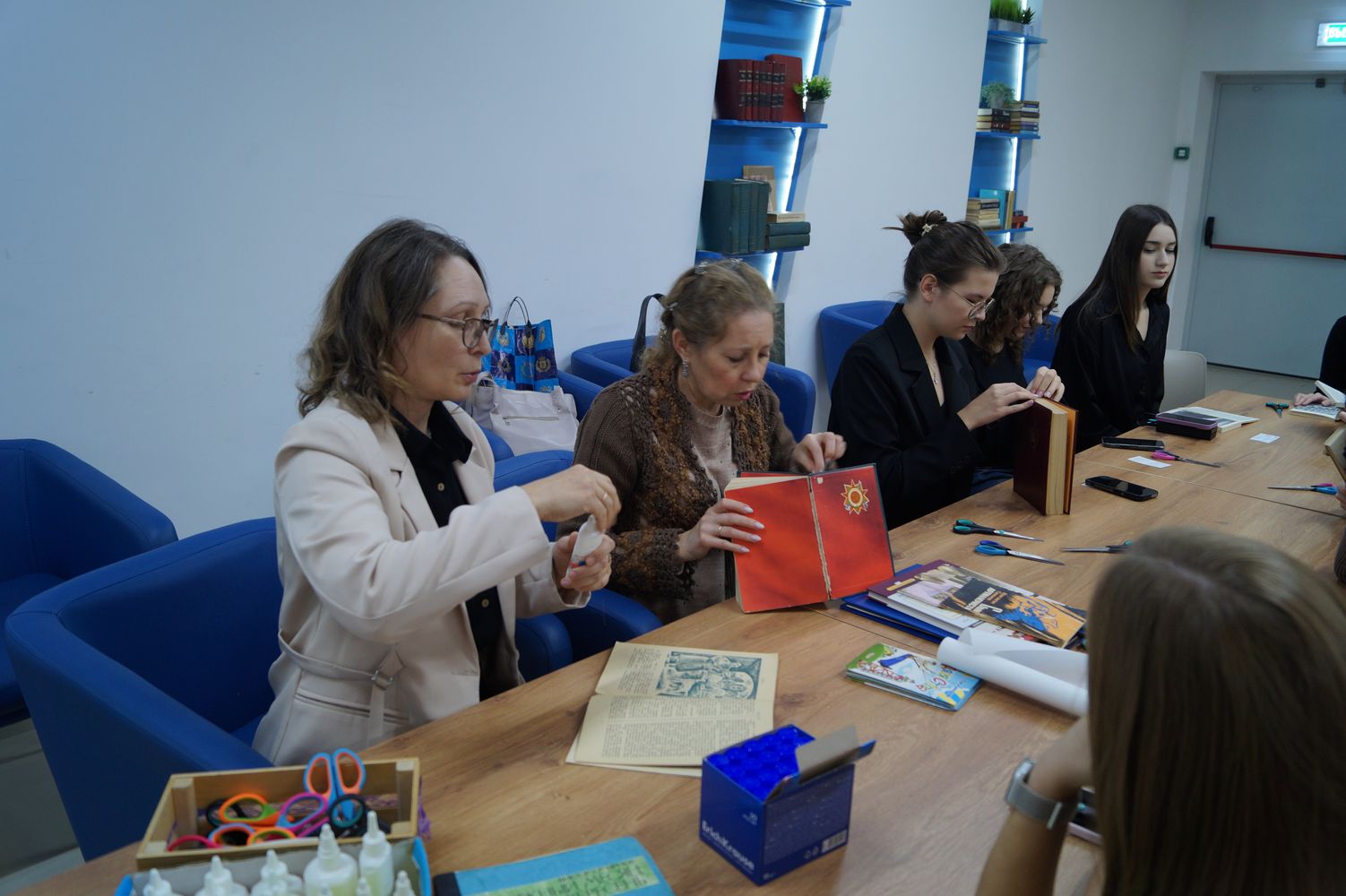 Студенты тут же применили полученные знания на практике, приведя в порядок книги из обменной библиотеки АНО Центр «Моя история». Во время работы обсудили, что именно нельзя делать при ремонте книг, на практике рассмотрели пример неудачного переплета, который случайно оказался среди поврежденных книг и т.д. В завершении беседы поговорили о правильном хранении бумажных изданий и способах продлить им жизнь.