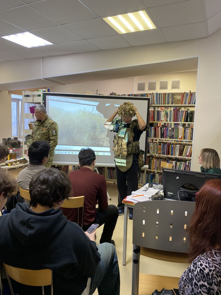 Андрей Викторович рассказал о своем боевом опыте, показал фото и видео из личного архива, на которых запечатлены элементы боевого слаживания, работа с беспилотниками, фрагменты устранения вражеской «птички» в небе и т.д. Также он на практике продемонстрировал работу тактических наушников, показал комплектование военной аптечки, показал, как с помощью жгута и турникета остановить кровотечение; дал ребятам примерить военный бронежилет и каску, чтобы они могли понять, насколько это тяжелая экипировка, даже без тактического рюкзака и оборудования.