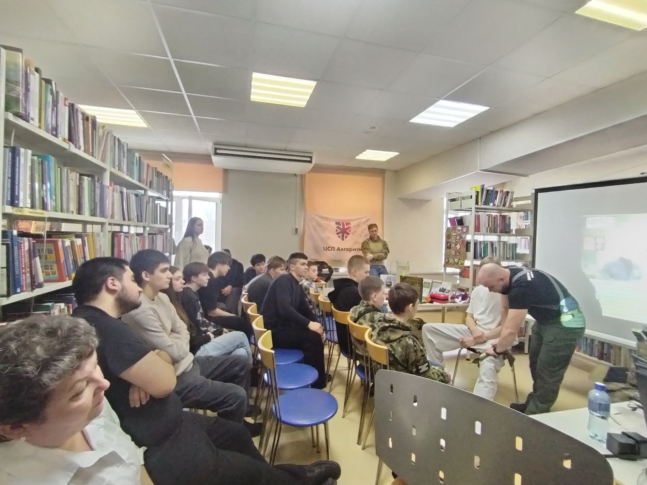 Олег Николаевич является инструктором первой помощи, инструктором по тактической медицине. По долгу своей деятельности он много взаимодействует с бойцами специальной военной операции, как в нашем городе, так и за его пределами, по возможности выезжает, как инструктор, обучать личный состав подразделений. Из его рассказа слушатели узнали о том, что за два-три дня на передовой в суровых боевых условиях человек становится тебе не просто другом, а, фактически, братом. Как важно чувствовать поддержку и надежное плечо рядом, ведь если случилось ранение, то во многом твоя собственная жизнь зависит не только от тебя самого, но и от твоего товарища. Солдат солдату – друг, спасатель и медбрат! Рассказал, как бойцы выручают друг друга на передовой. Особенно Олегу Николаевичу запомнился случай, рассказанный боевыми ребятами: солдату оторвало руку во время перестрелки буквально от плеча, его вытащили с поля боя, но он мог истечь кровью, и только благодаря грамотным действиям бойцов, поставивших катетер, солдат остался жив, а воины-спасатели получили медаль «За спасение погибавших». Олег Николаевич старался донести до каждого необходимость уметь оказывать самопомощь и первую помощь, на поле боя – владеть навыками тактической медицины.