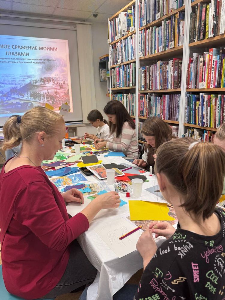 Завершил встречу мастер-класс по созданию коллажа «Бородинское сражение моими глазами» от творческой студии «Счастливый Художник». Используя цветную бумагу и подключив воображение, под руководством преподавателя творческой студии «Счастливый Художник», ребята создали необычные красочные панно.