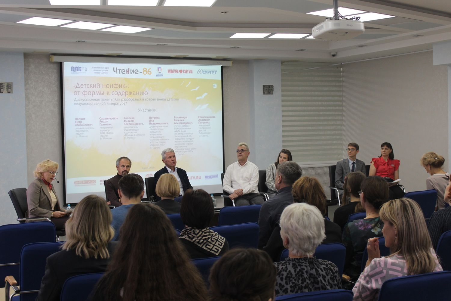 В тот же день, 12 сентября, любителей чтения пригласили на дискуссионную панель «Детский нонфик»: от формы к содержанию» с участием гостей из Москвы – детского писателя Петра Волцита, руководителя отдела продаж издательства «Пешком в историю» Филиппа Коленко, генерального директора ООО «Фирма “Гранд”» Рифата Саразетдинова, а также директора магазина «Читай-город» Яны Петровой (г. Сургут), учителя истории МБОУ лицей им. генерал-майора В. И. Хисматуллина Василия Вохминцева и заведующего Центральной детской библиотеки Анастасии Гребенщиковой. В ходе разговора обсудили ситуацию в детской нехудожественной литературе, критерии оценки книг в жанре нон-фикшн, навигаторы и рекомендательные списки, на которые можно ориентироваться при выборе книги и т.д. В итоге участники встречи пришли к мнению, что главное определение книг в жанре нон-фикшн – это «полезная литература».
